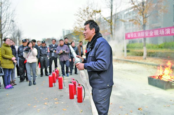 讲座结束后,南校区安保部有关负责同志向大家现场示范了灭火器和消防栓的使用方法,并组织大家进行了实战演练。