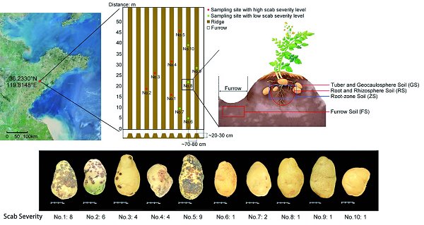 马铃薯疮痂病是世界上普遍发生的一种顽固性病害,可造成10%至30%的减产,部分地块甚至减产40%以上,其感染该病的马铃薯表皮有不少疮疤,不耐贮藏。研究人员大都聚焦在该病致病菌生痂链霉菌的单一作用,而在生产中此菌和土壤微生物是否有协同作用并不清楚。近日,山东农业大学生命科学学院高峥教授和周波副教授团队发表在国际知名期刊 《微生物组》(Microbiome)上的研究揭示了马铃薯疮痂病发病新机制,认为土壤微生物种群的组成和功能与马铃薯疮痂病的严重程度有关。