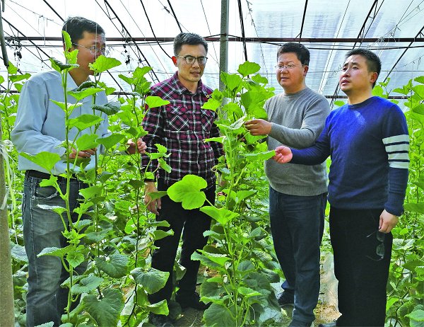 图为第一书记及驻村工作队员现场查看大棚蔬菜长势