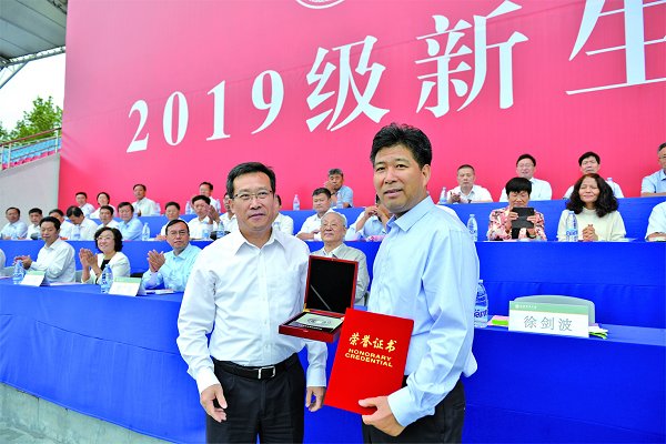9月12日上午,山东农业大学 2019级本科生开学典礼在南校区体育场举行。7000余名新生共同开启青春新征程。 典礼上,党委书记徐剑波为山东农业大学第八届杰出校友颁奖。图为曲福田校友从徐剑波手中接过证书和奖牌。 (详见第六版)