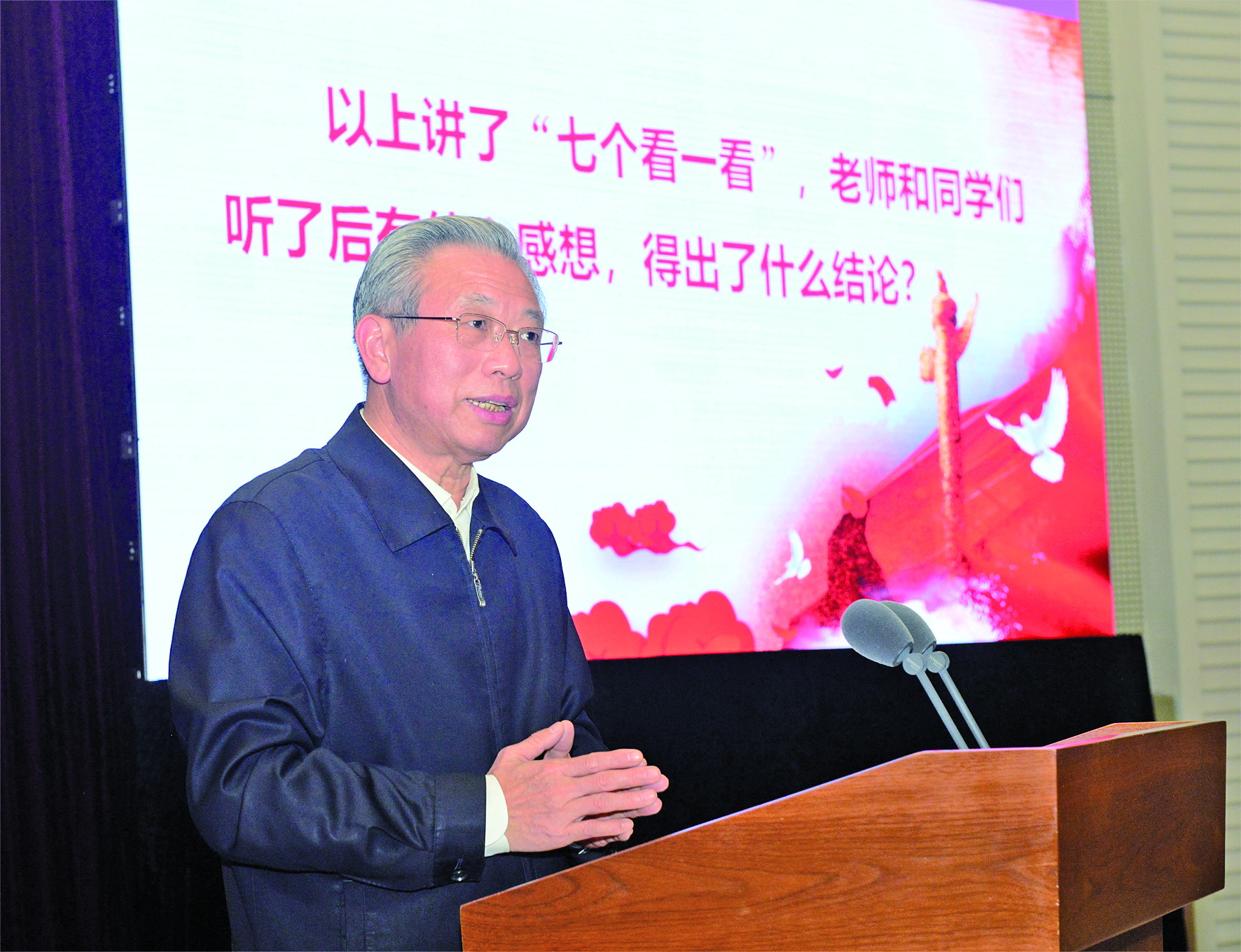 刘家义结合自身经历和工作实际,从经济发展、安全稳定、民生福祉、科技进步、政治文明、国防军事、国际地位等七个方面,介绍了近年来国家发展取得的辉煌成就和人民生活发生的巨大变化,阐明了全会的重大意义,阐述了中国特色社会主义制度和国家治理体系的科学内涵和本质特征,阐述了坚持和完善中国特色社会主义制度、推进国家治理体系和治理能力现代化的重大意义、总体要求、总体目标、重点任务和根本保证,对深入领会全会精神、坚定“四个自信”谈了认识体会。宣讲运用古今中外大量生动鲜活的案例、数据、图表进行讲解,主题鲜明、重点突出,深入透彻、通俗易懂,对深入学习领会全会精神提供了有力辅导。刘家义还与师生进行了互动交流、答疑解惑,对践行初心使命、推动高校高质量发展、服务乡村振兴等具体问题一一作了回答,积极回应大家关心关注的现实问题。在场师生认真听、认真记,踊跃提问,现场气氛活跃,不时响起热烈掌声。