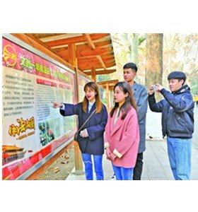 图为青年学生驻足在宣传栏前,学习宪法知识
